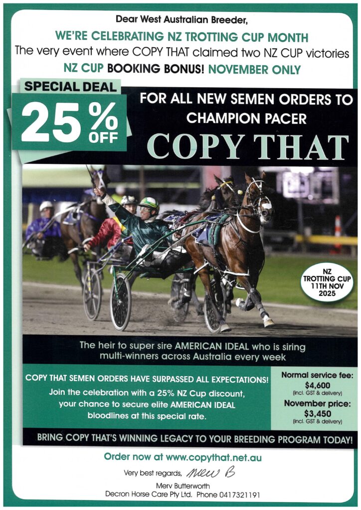 - HE IS HERE – champion New Zealand stallion Copy That (American Ideal USA) 1:52 NZ$2,019,937 is standing WA this season