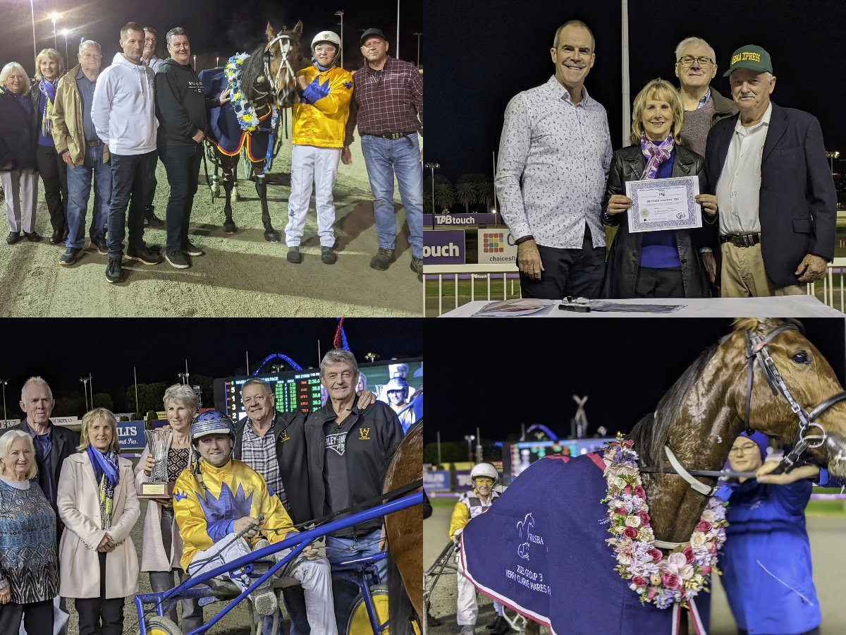(June 2024) $50,000 Group 3 KERRY CLARKE MARES – in recognition of former WASBA President Kerry Clarke who worked tirelessly for the breeding industry in WA. WASBA provides the trophy, rug and garland. Starting from inside the back line, WA bred 5yo Acharne Girl (Alta Christiano NZ) won an epic dual down the straight against her stablemate and race favourite to win by by a half head in 1:56.3, last half 56.7 with Stewie McDonald taking the driving honours.