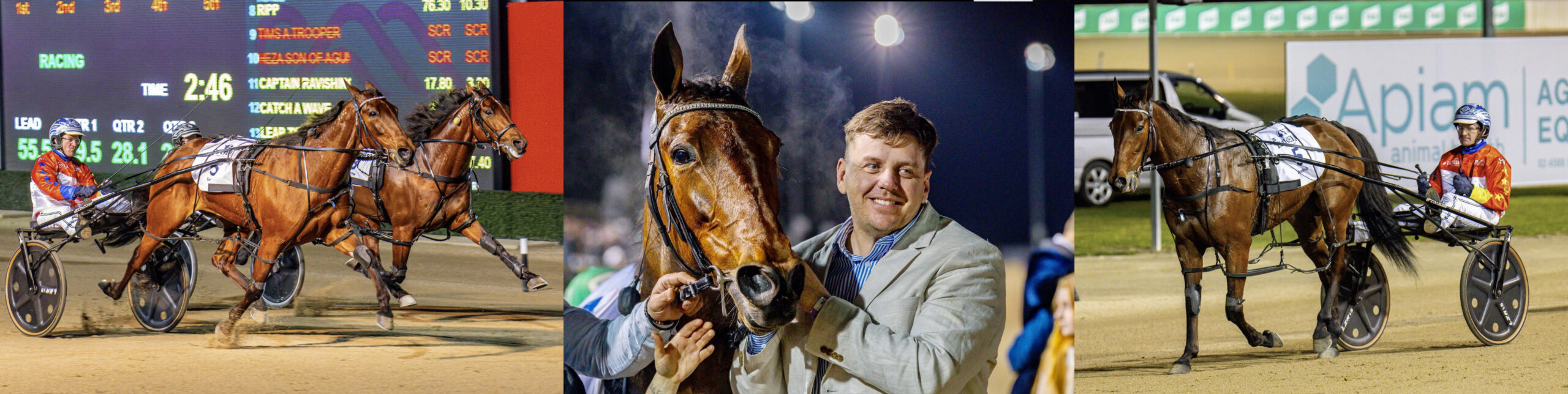 (Apr 2024) $14,000 WASBA KING-LETHBRIDGE MEMORIAL WESTBRED MARES – at Pinjarra, with 4yo maiden mare The Wand Waver (Control The Moment USA) expertly driven by Shannon Suvaljko for Moomba Standardbreds owners Gary and Deb Jones (below), sliding up the sprint lane to win by 2.7m in 1:58.7.